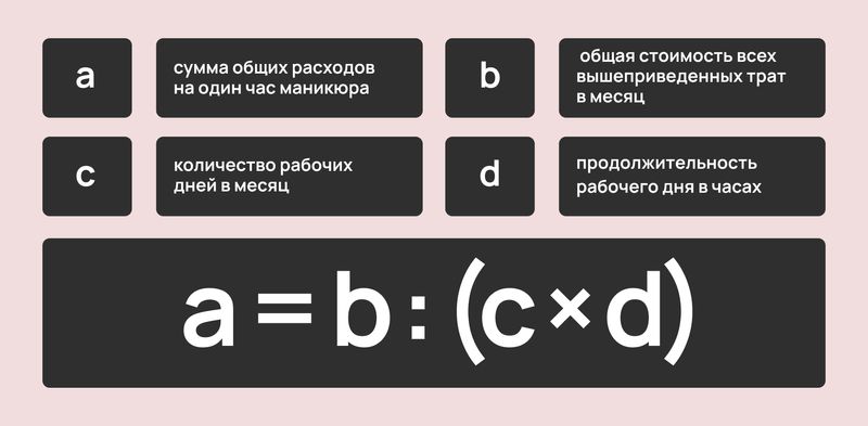 Стоимость одного часа работы + стоимость общих расходов на час маникюра +