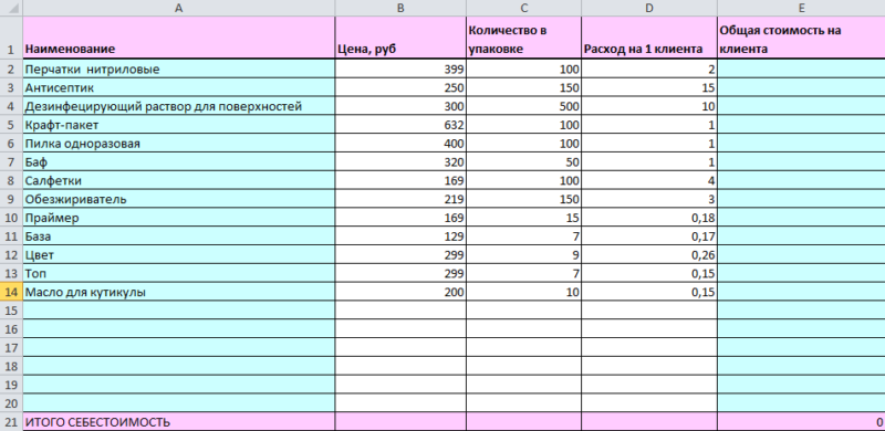 Математические вычисления невозможны без учета всех материалов и инструментов, задействованных в процедуре маникюра. Для удобства можно посчитать расходы в электронной таблице Excel. Благодаря автоподсчету, который можно настроить в таблице по ячейкам, все упрощается.
