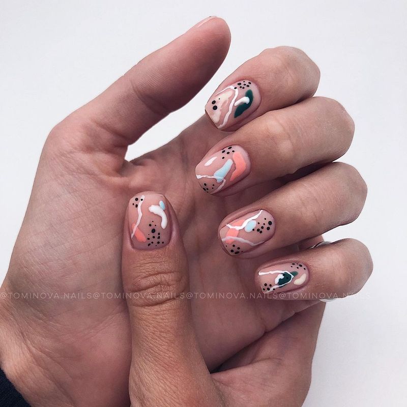 Абстракции в маникюре — вот он, бескрайний простор для фантазии! Хаотичные мазки и брызги, своеобразные необъяснимые рисунки и сочетания цветов — приветствуется непредсказуемостЬ в любом ее проявлении. Дизайн могут повторить как опытные мастера, так и самоучки, достаточно незаурядных идей, воплотить которые могут помочь наклейки и трафареты для ногтей. А украсив такой маникюр переводной фольгой и гелем "паутинка", ноготки станут не просто интересными, но еще и роскошными.